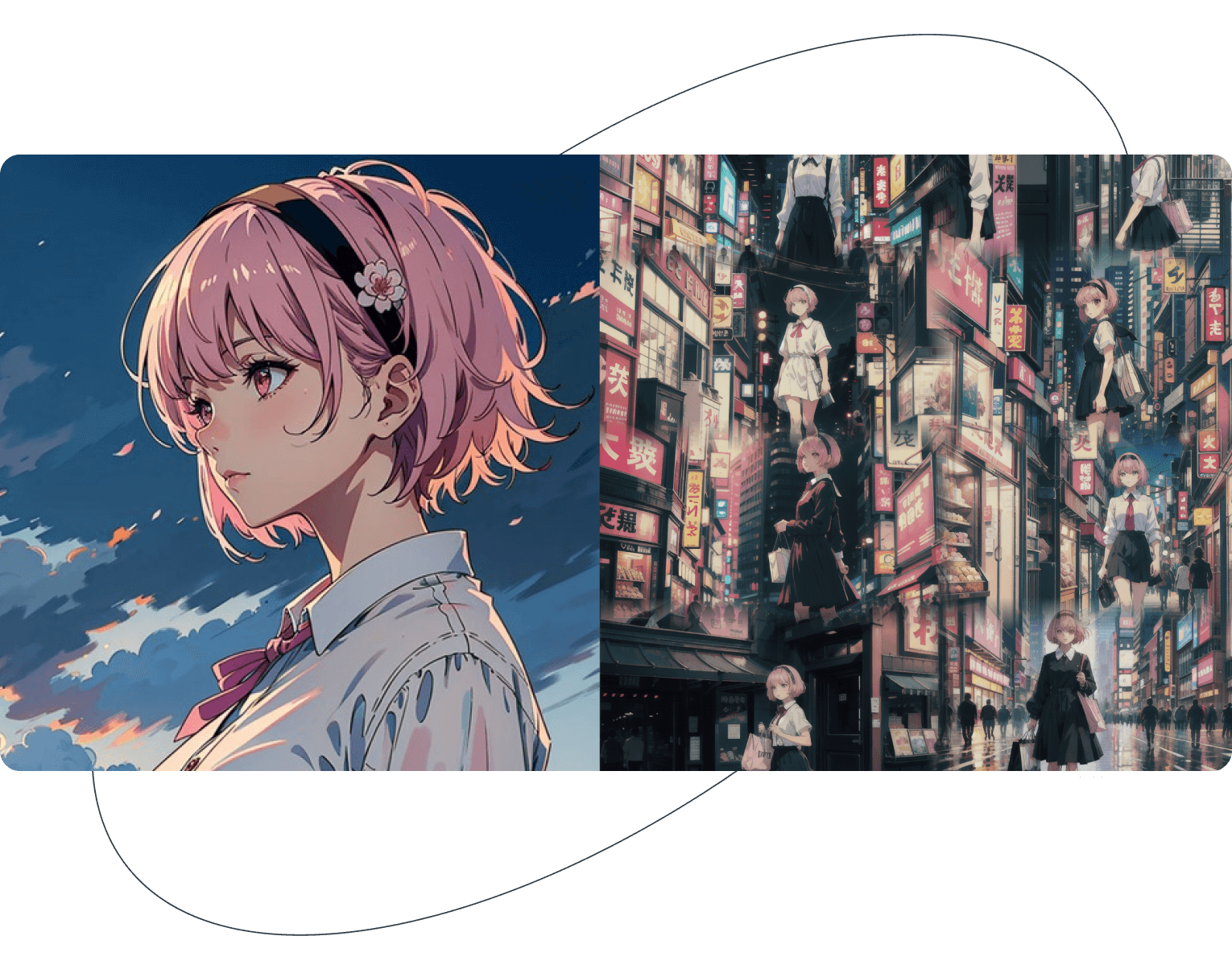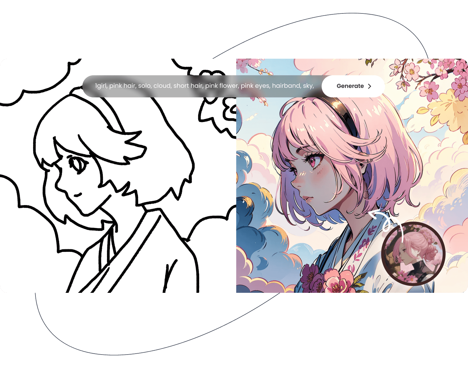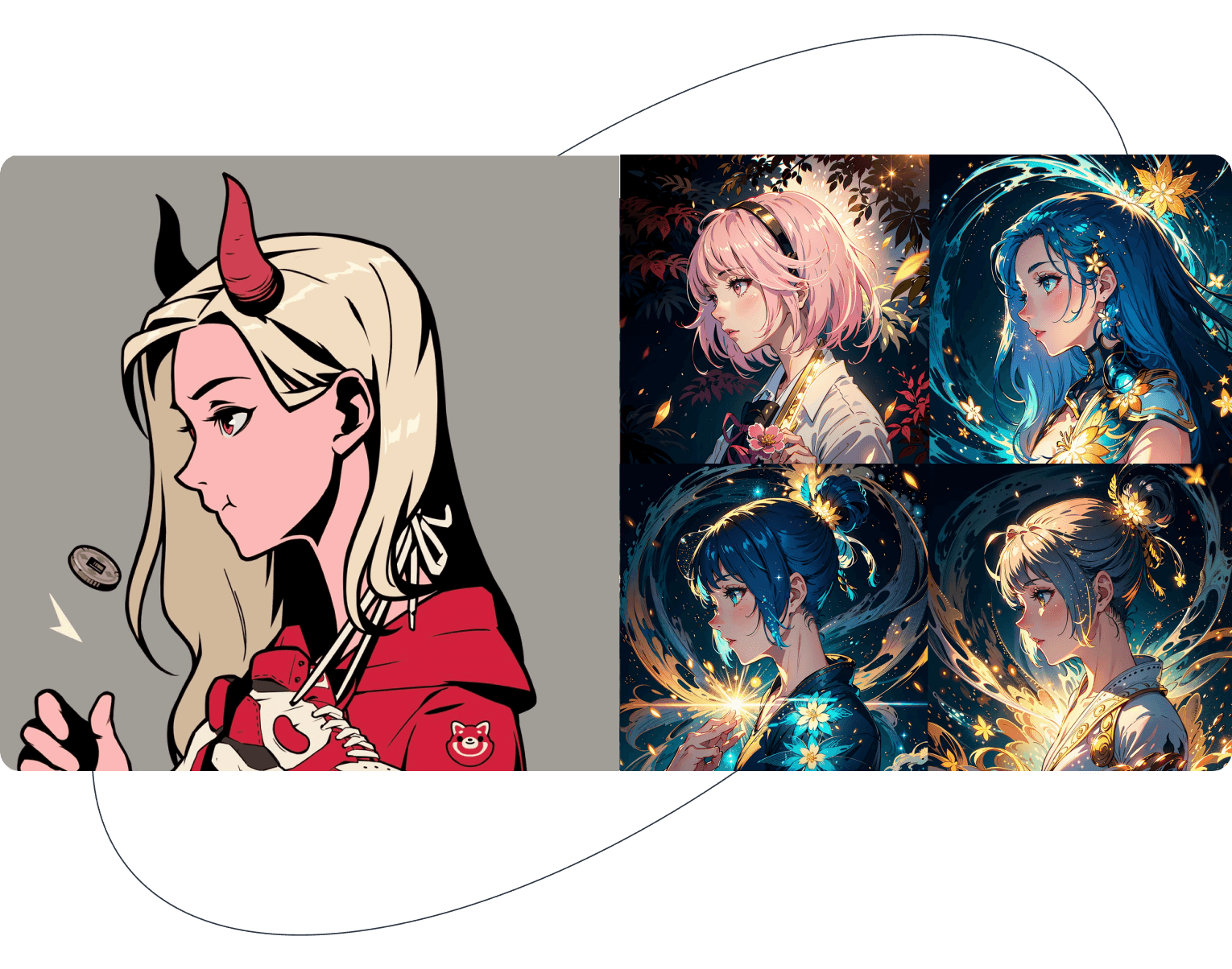 Make your own unique virtual characters using keywords, sketches, and example works.